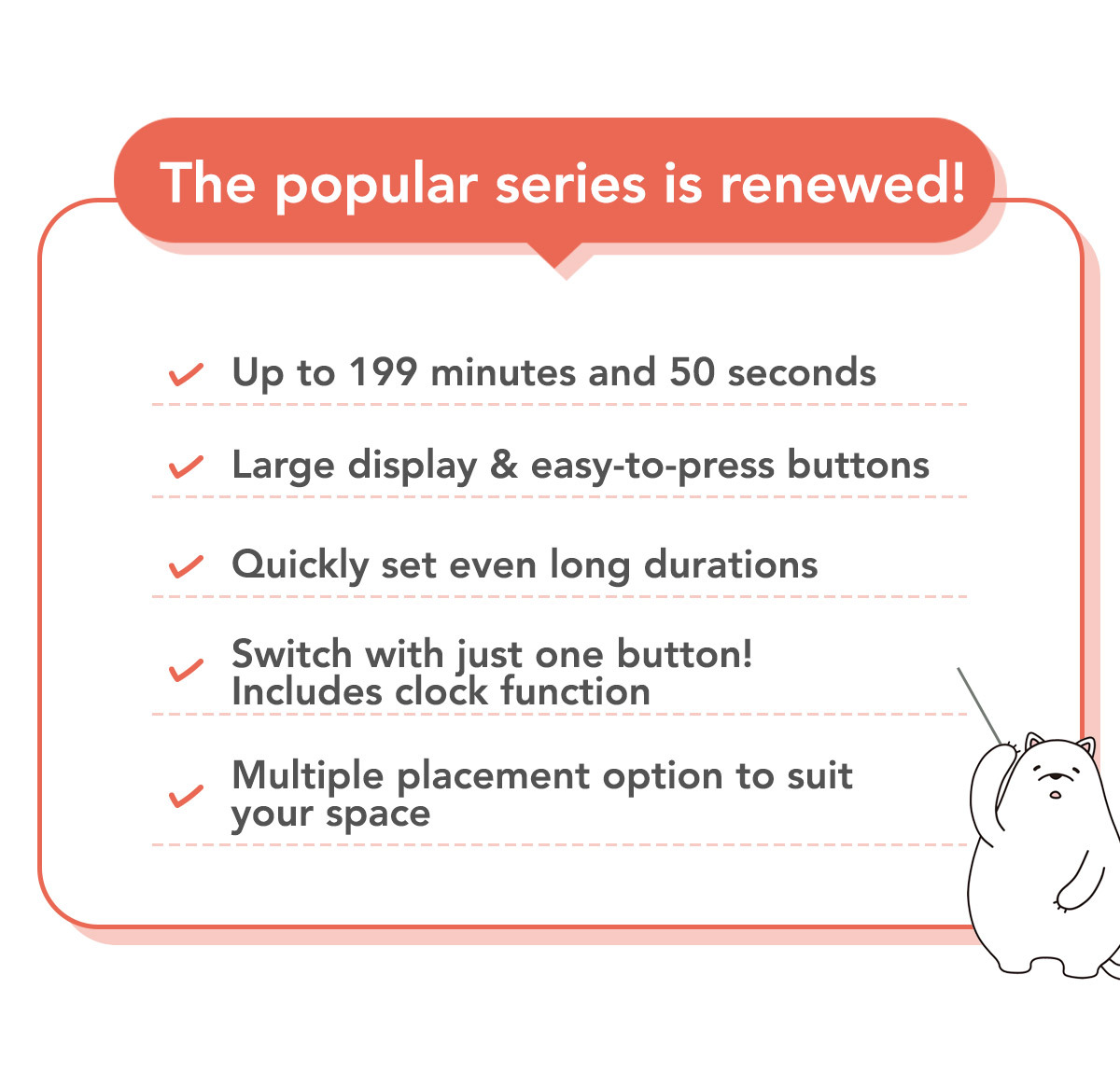 - Measures up to 199 minutes and 50 seconds