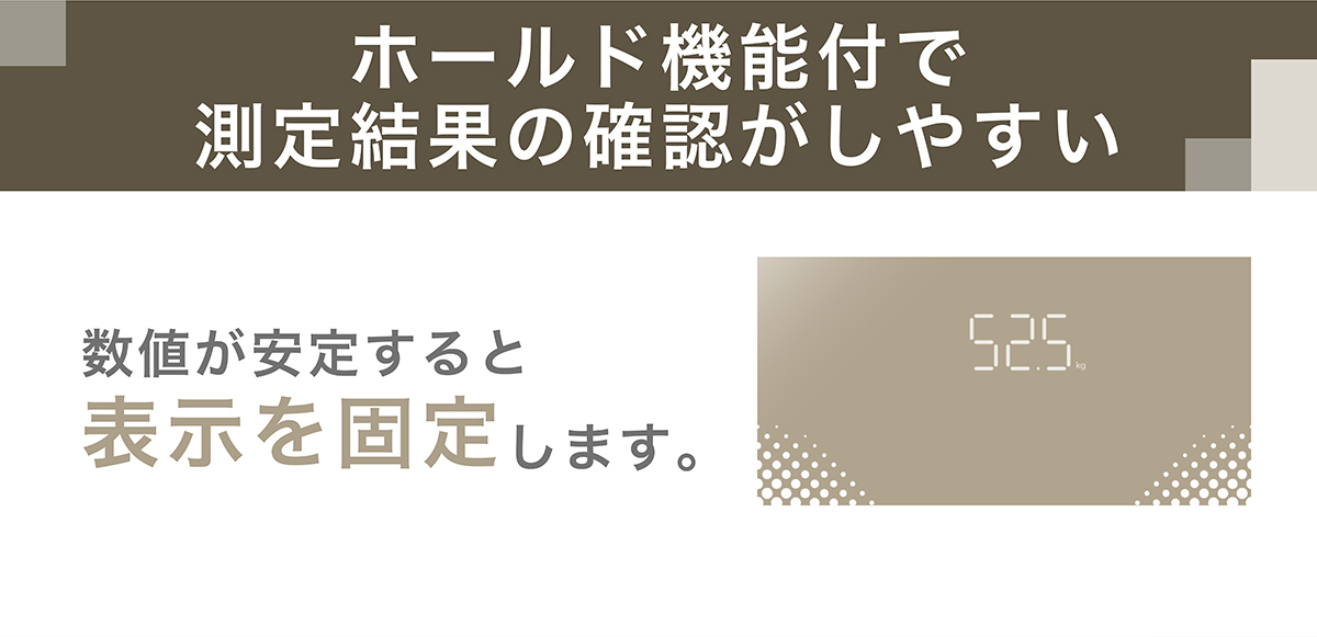 - 数値が安定後、約5秒で表示を固定(ホールド機能)