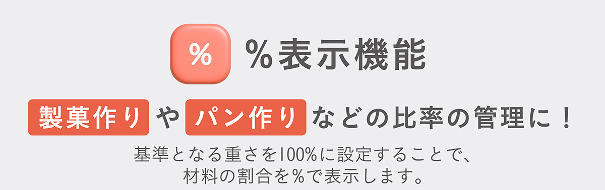 - 設定した重さに対して、計量物の重さを割合で表示する%表示機能付