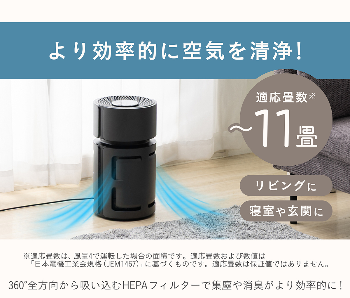 - 360°全方向から空気を吸い込むHEPAフィルターにより効率的に清浄