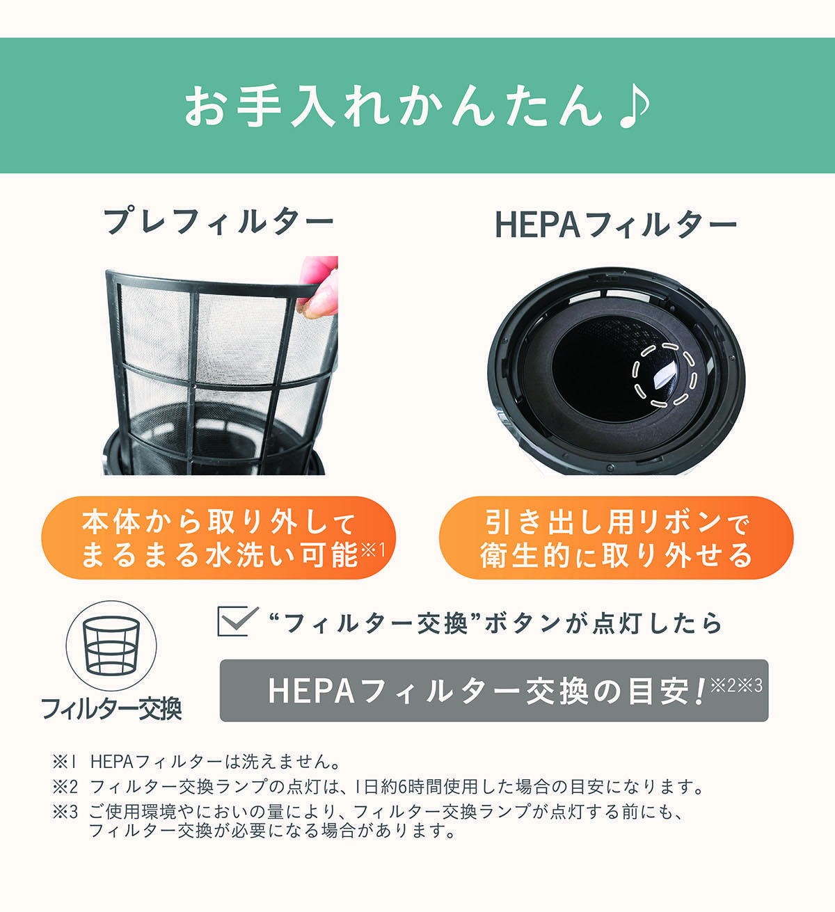 - HEPAフィルター交換の目安をお知らせ
