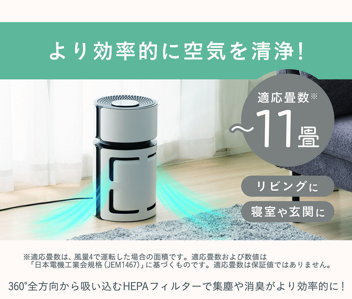 - 360°全方向から空気を吸い込むHEPAフィルターにより効率的に清浄