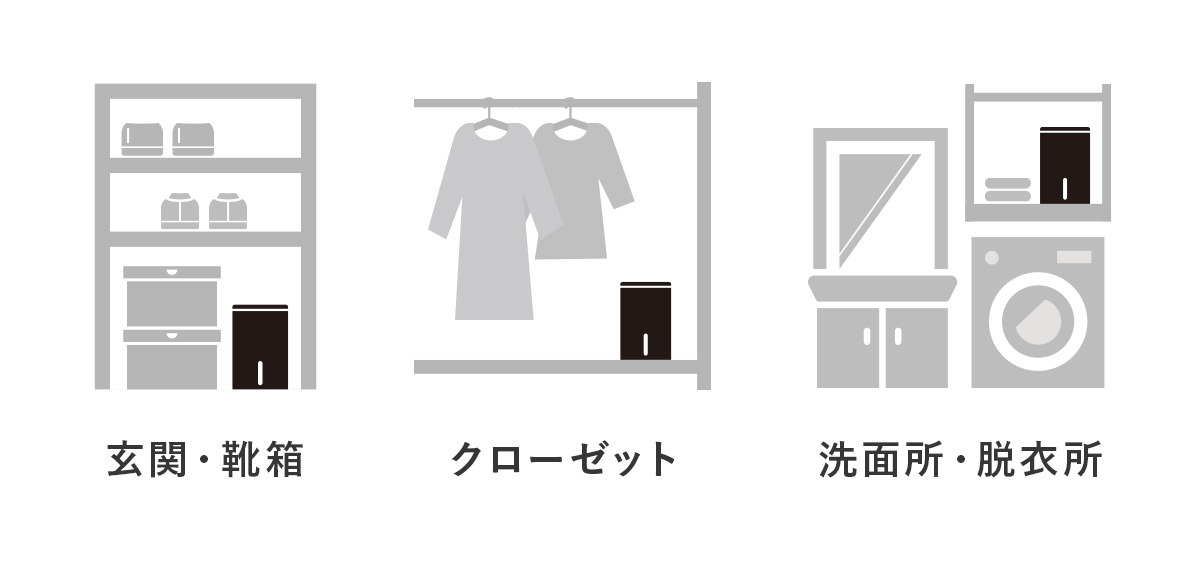 - カビ臭さ・結露を防ぐ省スペースの除湿機 ※玄関やクローゼット、洗面所、結露が気になる狭いスペースに