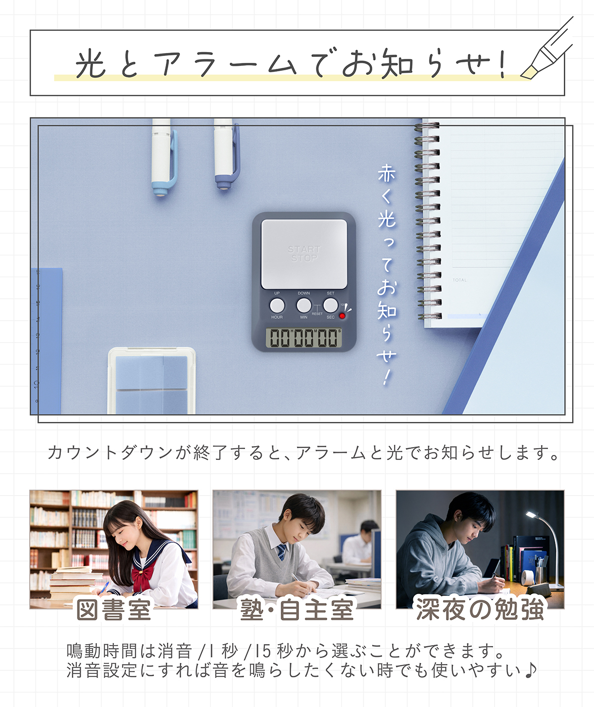 - 選べるアラーム鳴動時間(無音、1秒、15秒)
