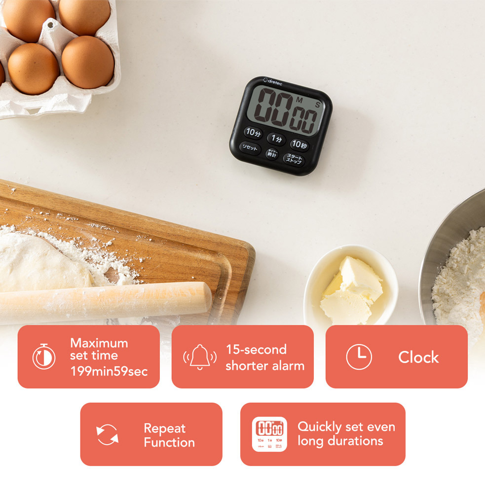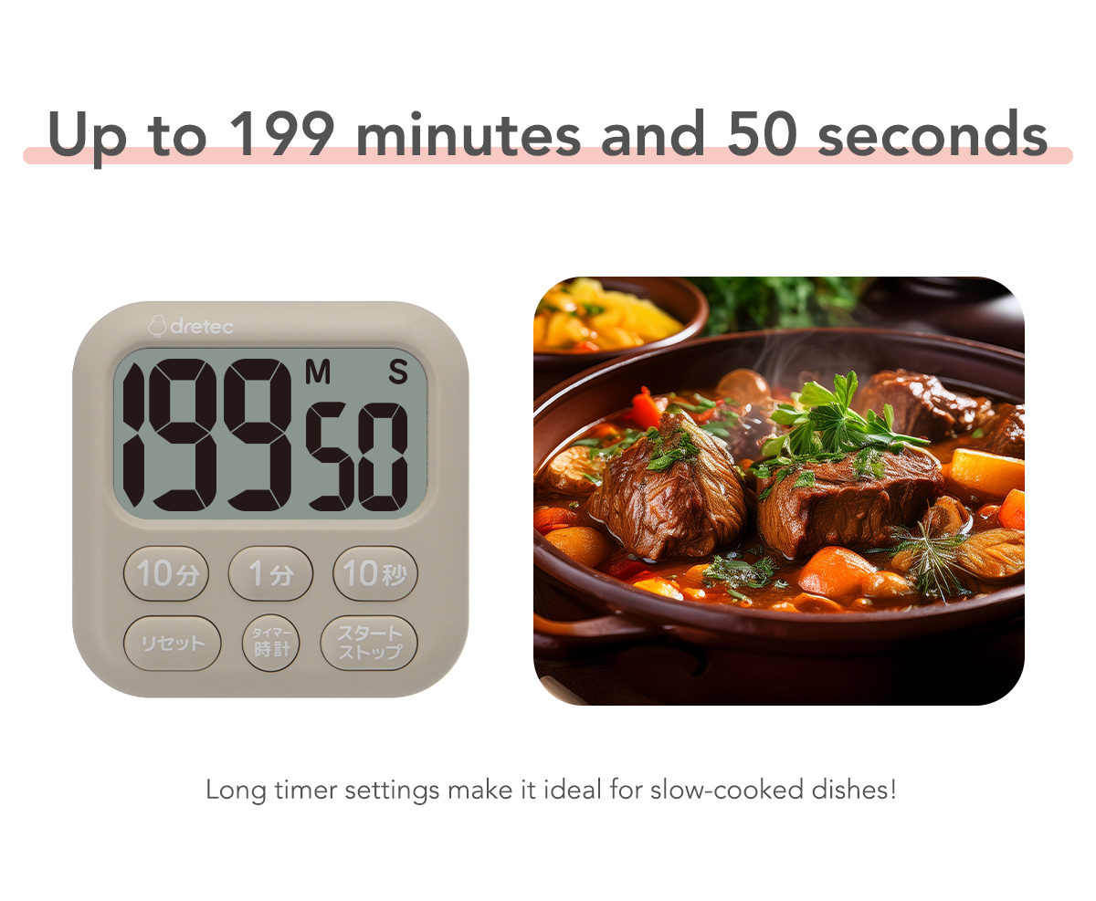 - Measures up to 199 minutes and 50 seconds