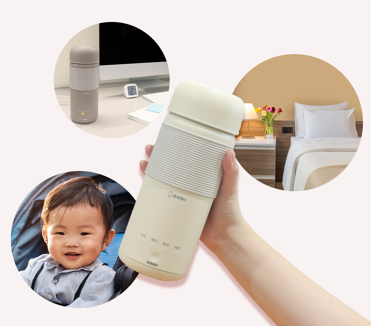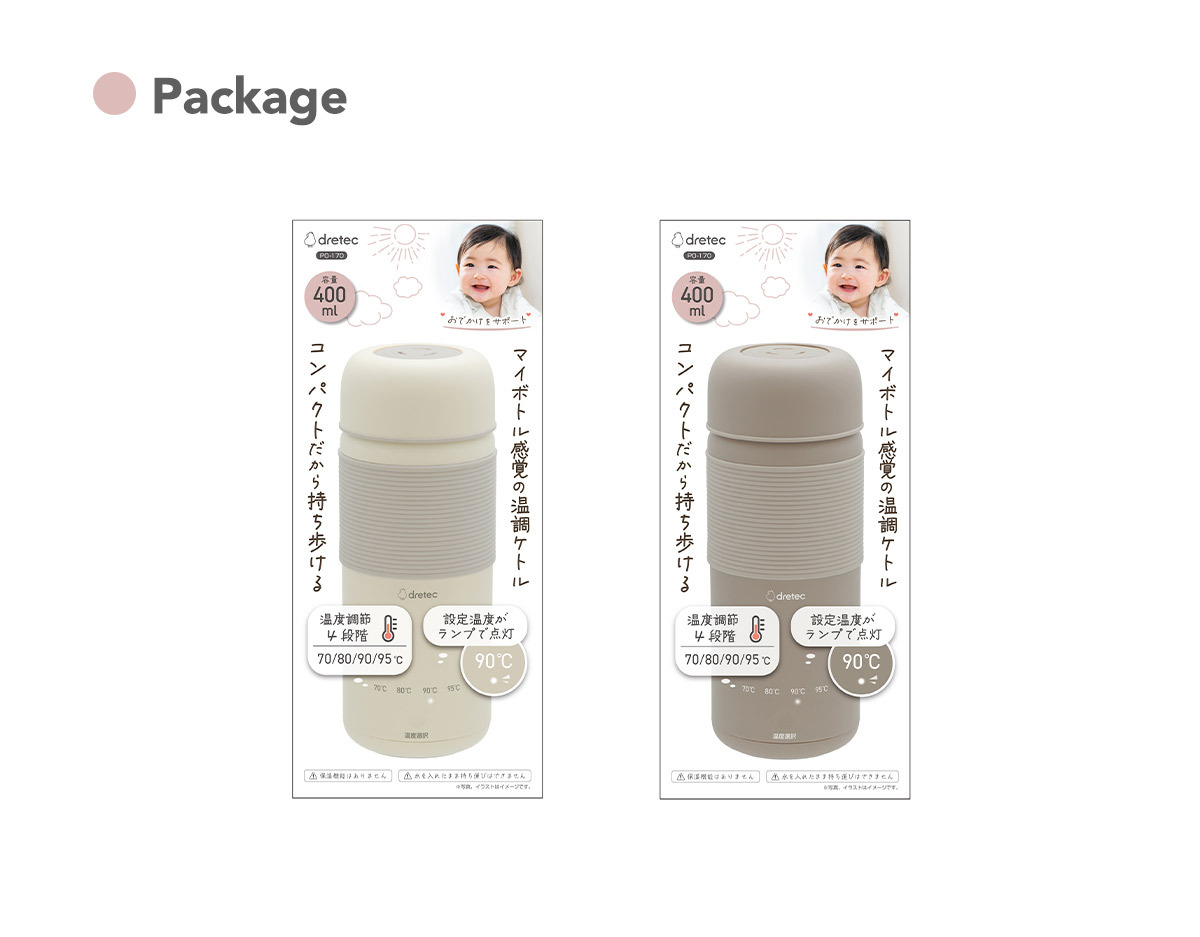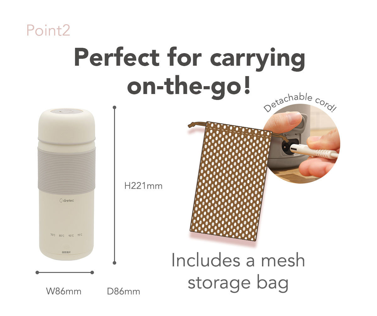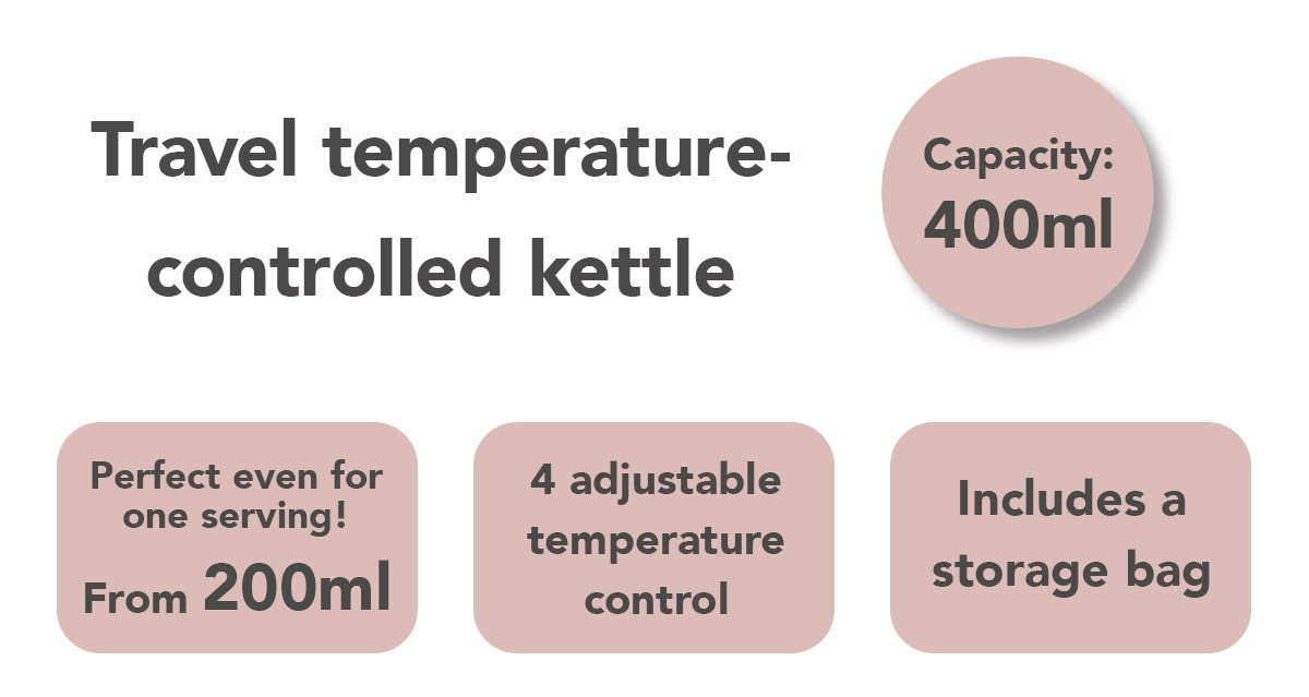 The “Travel Temperature-Controlled Kettle” boils water from 200ml simply by plugging it into an outlet or portable power source!