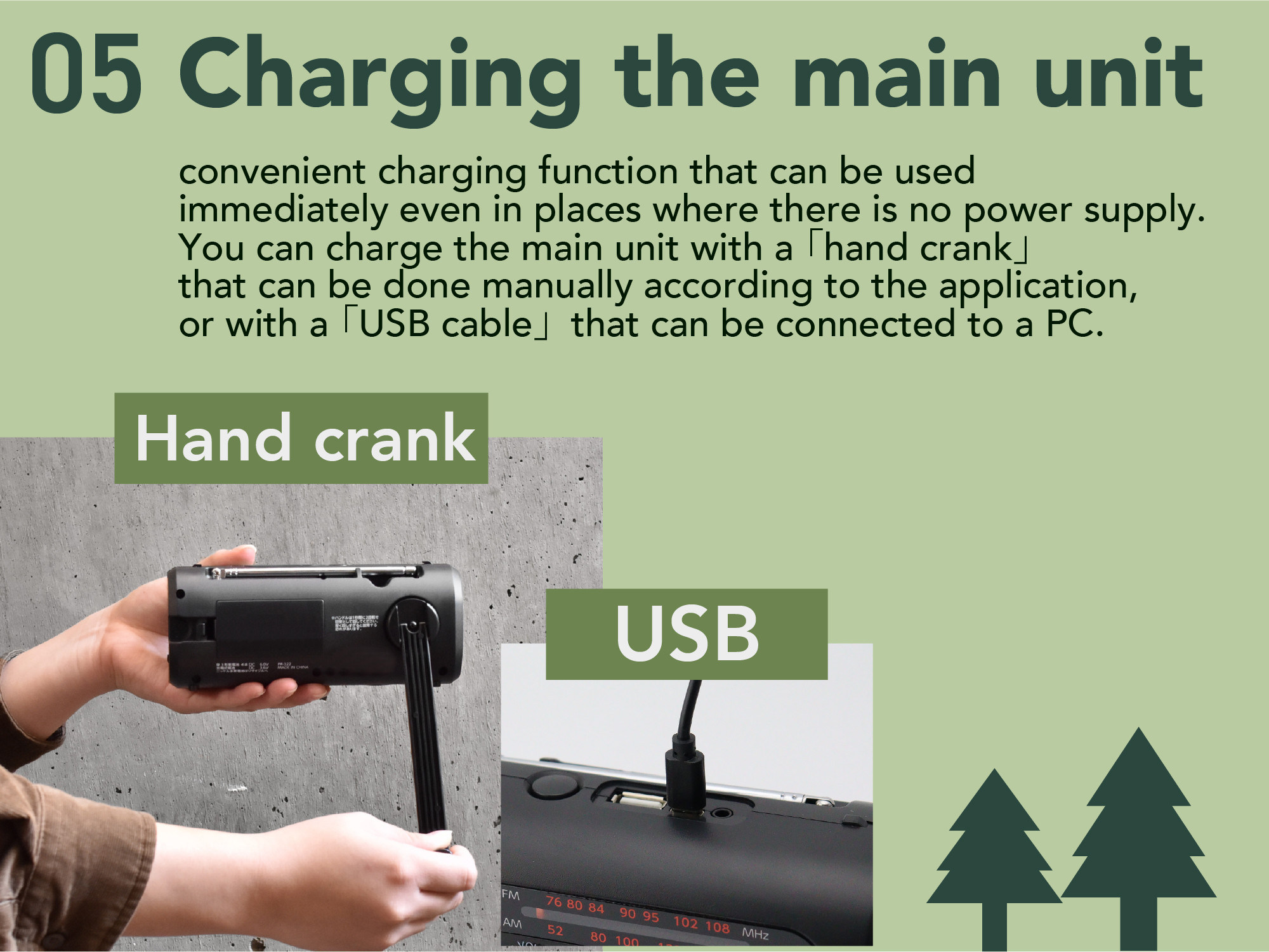 - Built-in rechargeable battery can be recharged by hand cranking