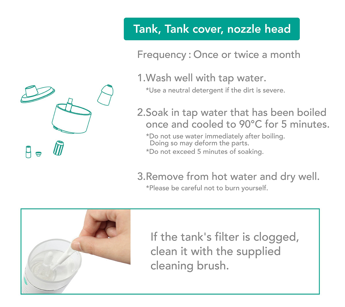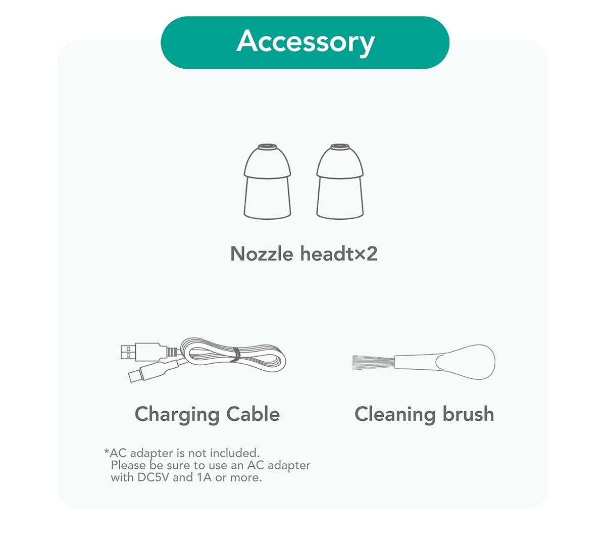 - 2 nozzle heads, 1 charging cable, 1 cleaning brush