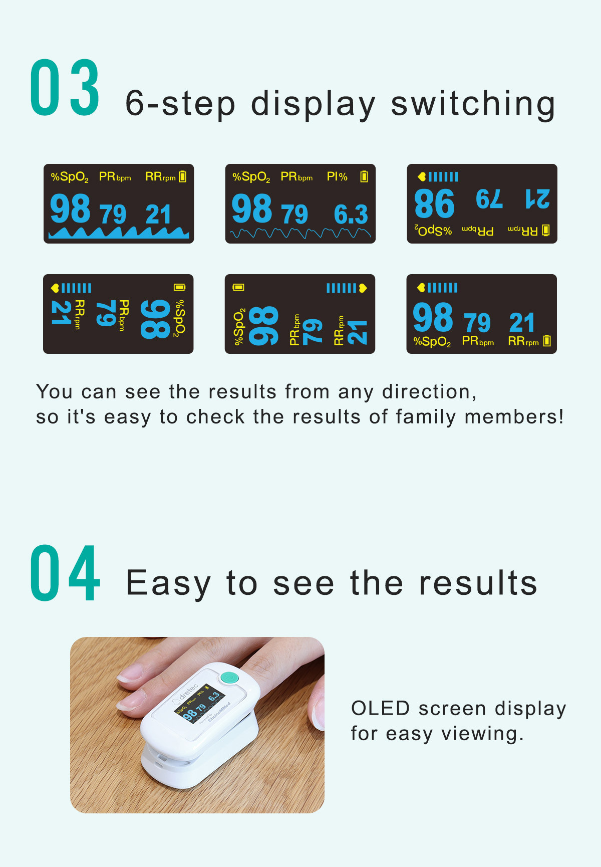 - Measures blood oxygen saturation (SpO2), pulse rate, and PI value