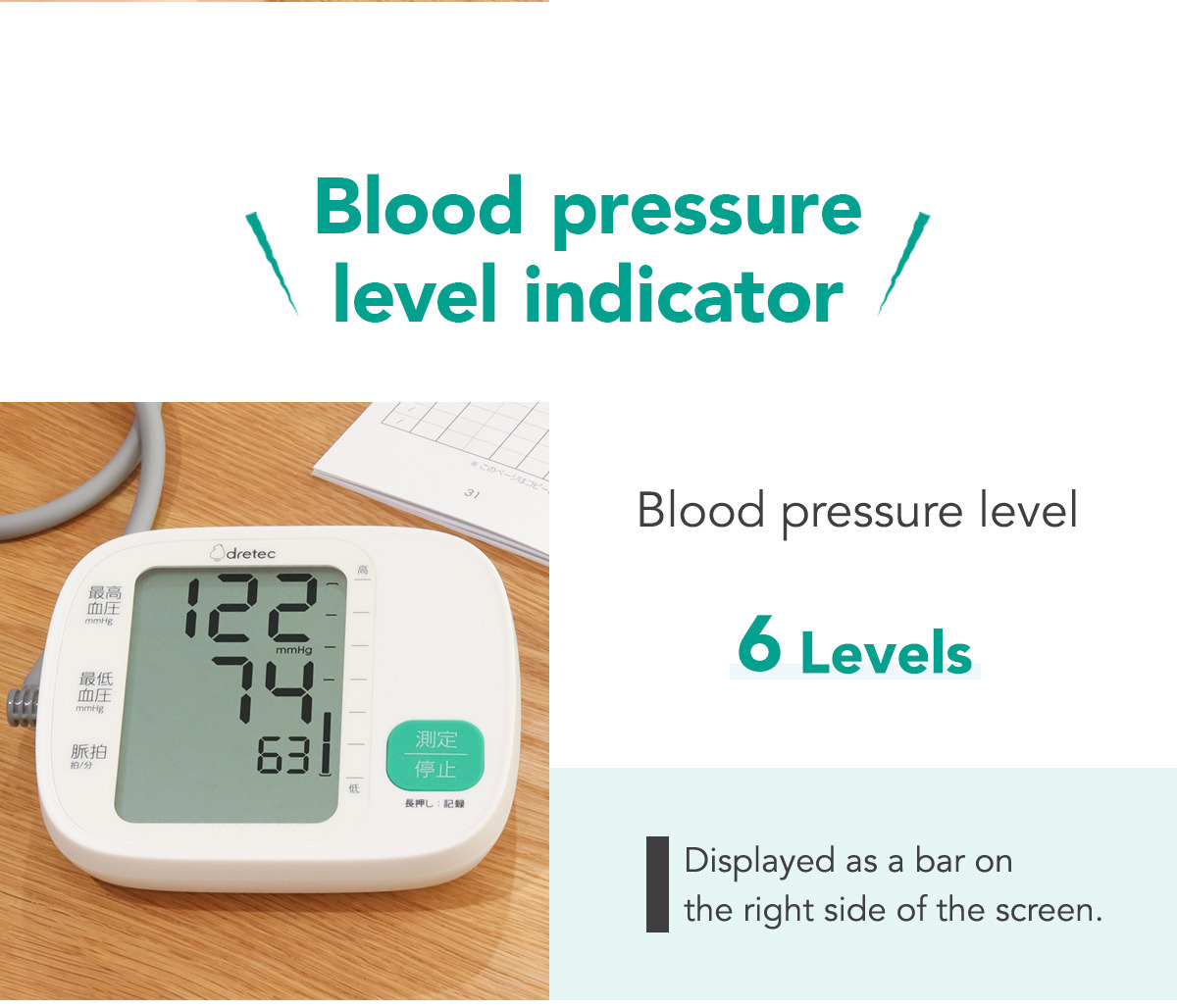 - Displays blood pressure levels in 6 stages