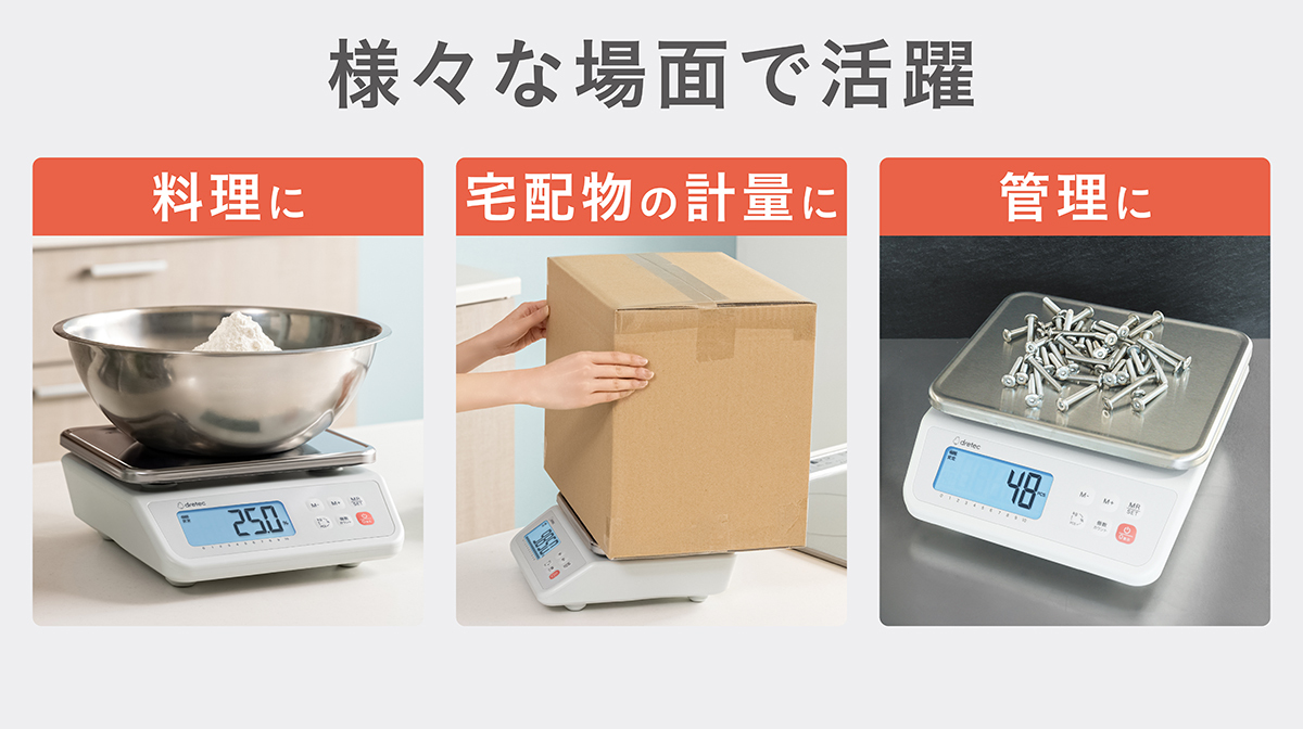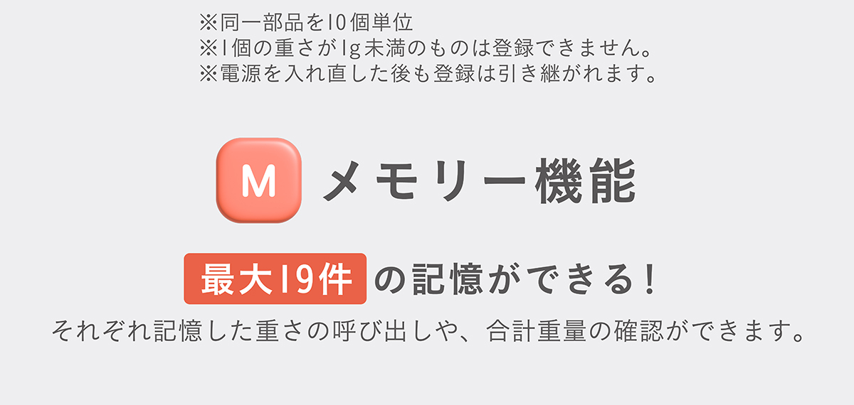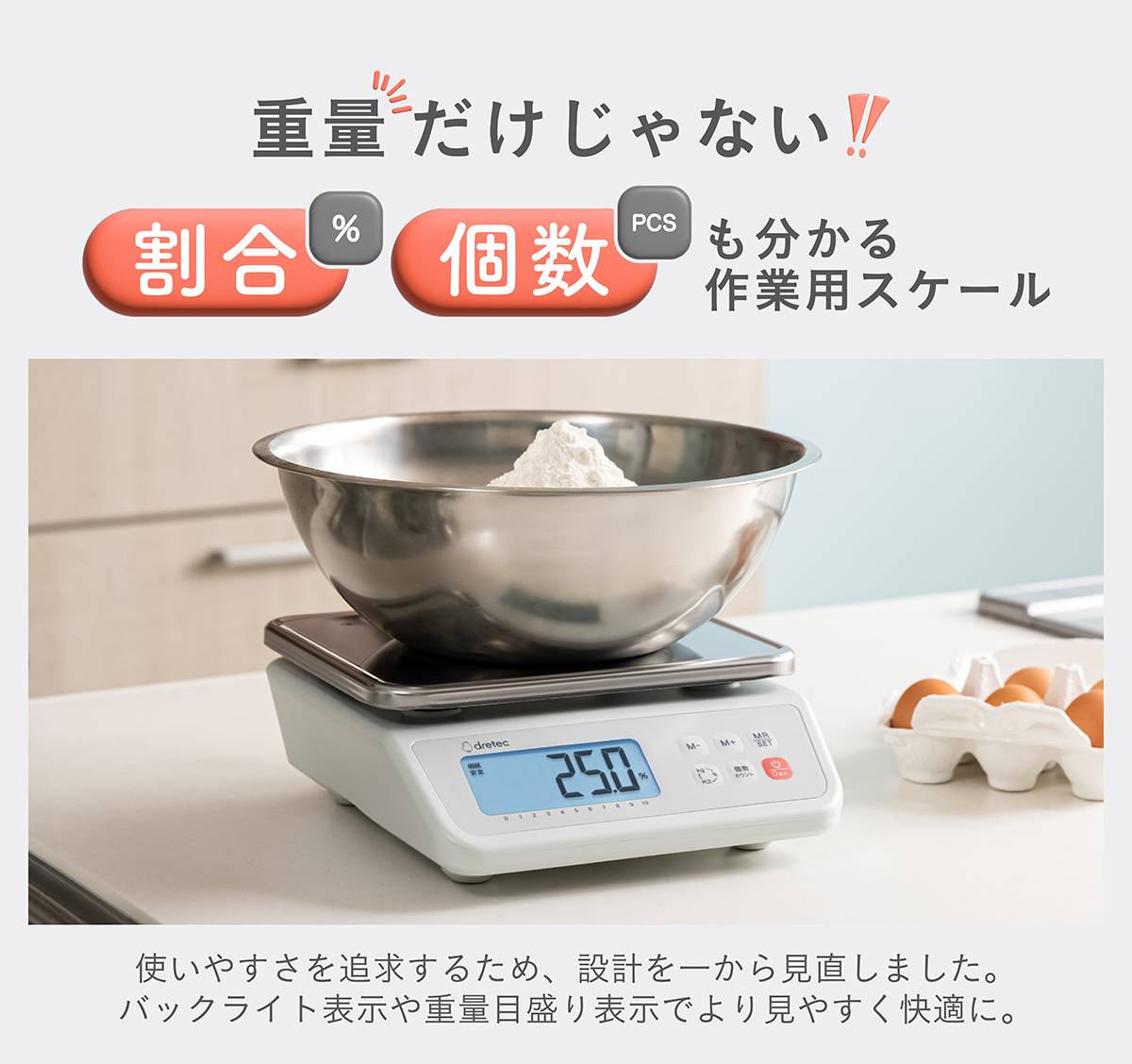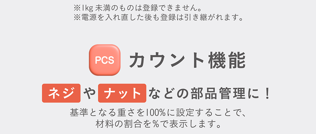 - 設定した重さに対して、計量物の重さを割合で表示する%表示機能付