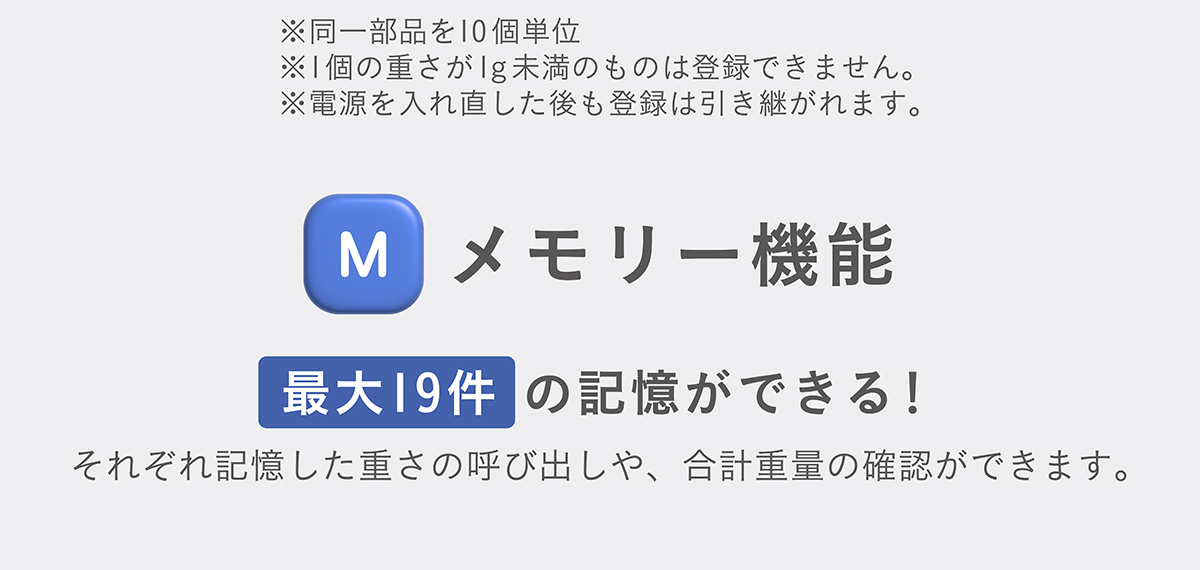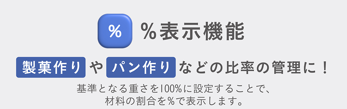 - 設定した重さに対して、計量物の重さを割合で表示する%表示機能付