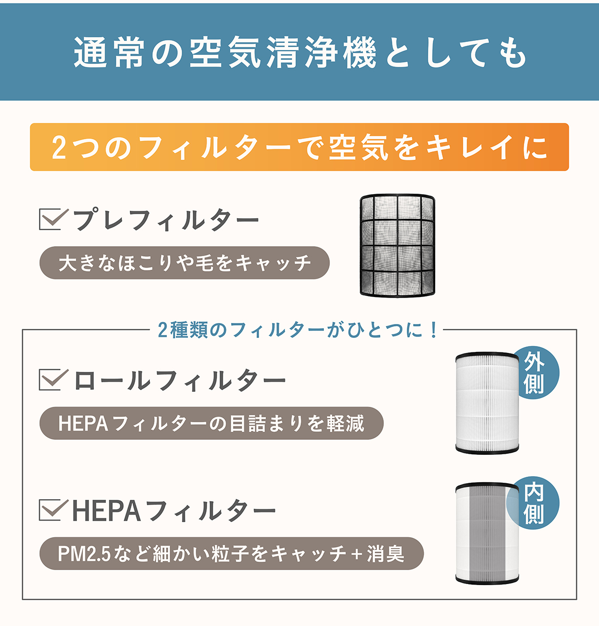 - 脱臭活性炭を練り込み 脱臭機能を強化した特別製HEPAフィルターを使用