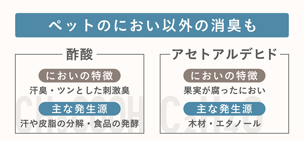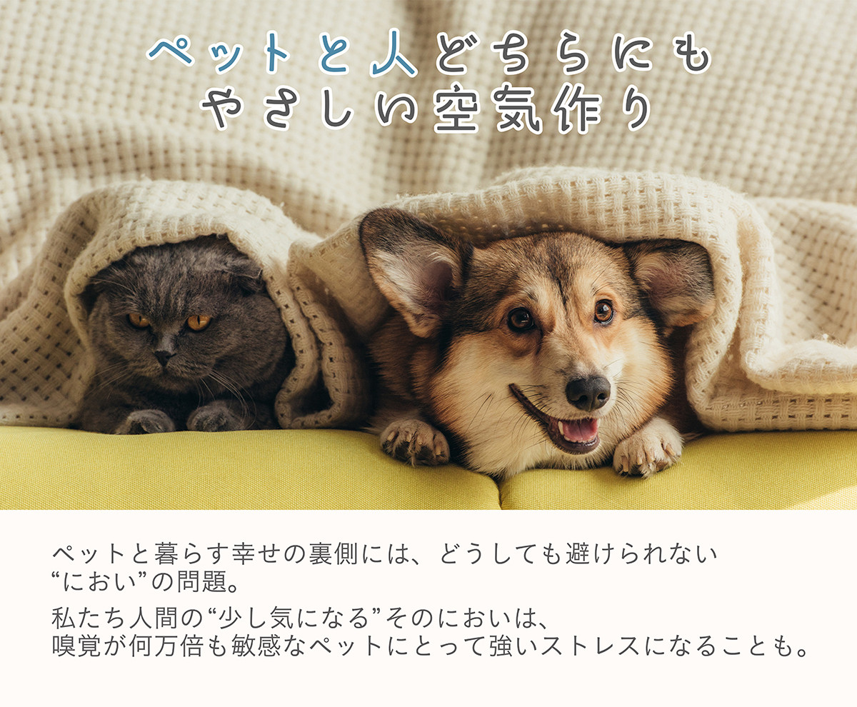 - ペット臭の原因である「アンモニア」「メタンチオール」「硫化水素」「トリメチルアミン」のにおいに特に効く!