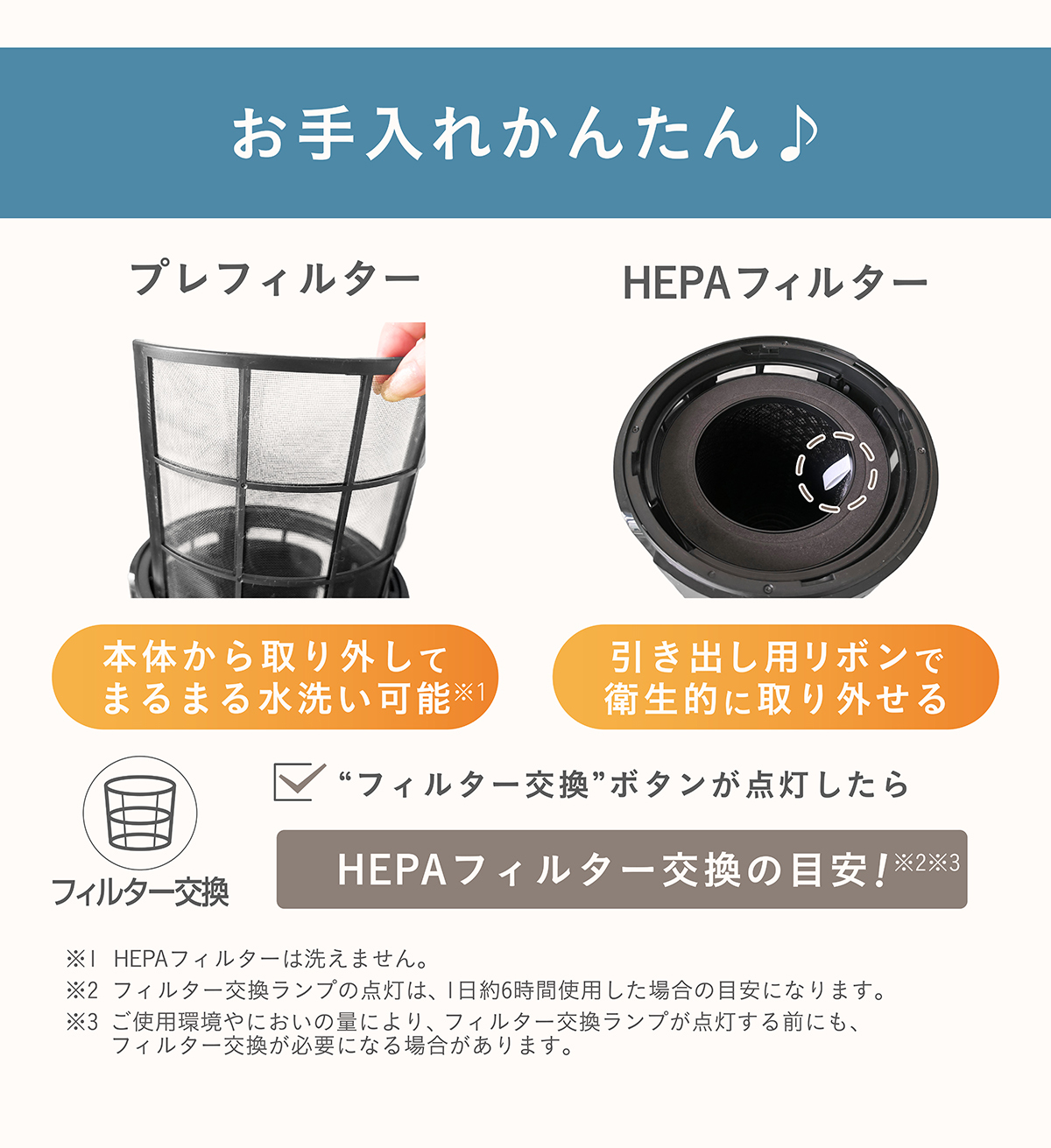 - HEPAフィルター交換の目安をお知らせ