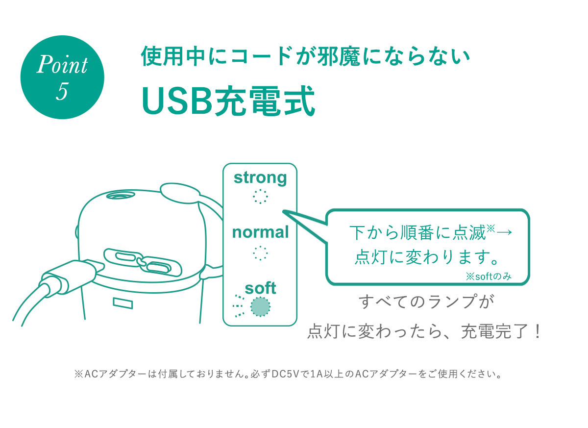 - USB充電式※ACアダプターは付属しておりません。必ずDC5Vで1A以上のACアダプターをご使用ください。