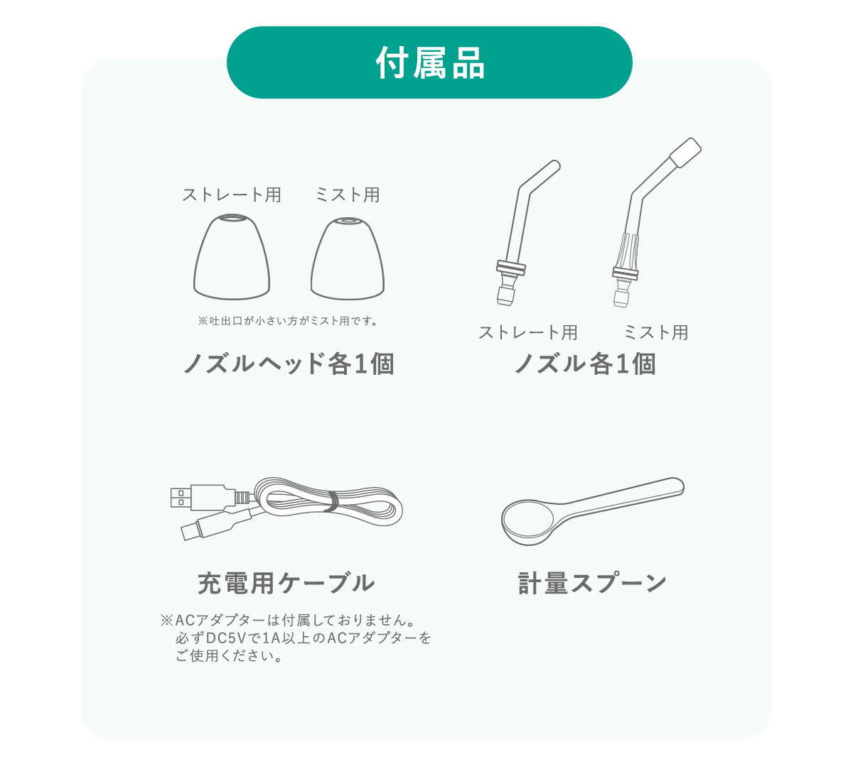 - 専用充電ケーブル/ストレートノズル・ミストノズル各1個付
