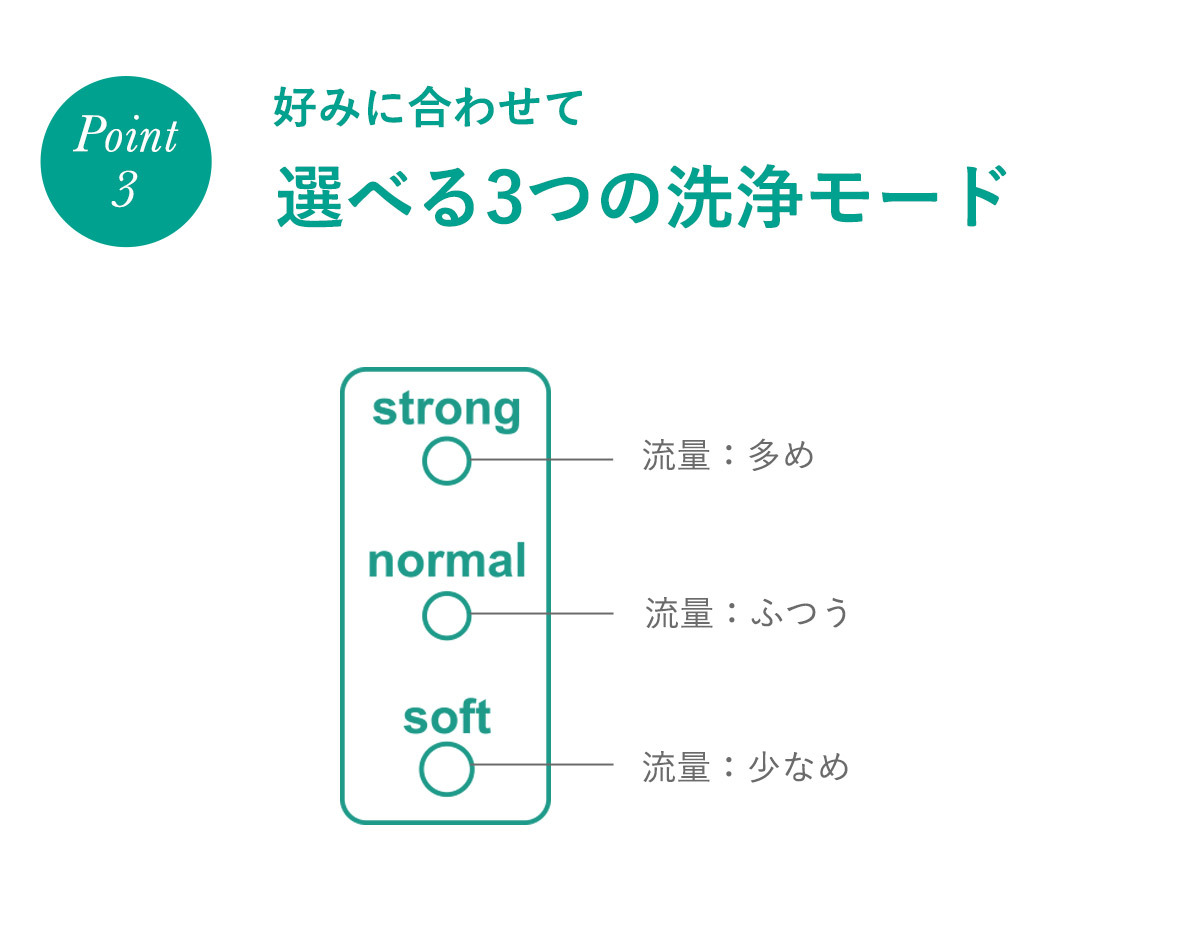 - 選べる3つの洗浄モード(流量:多め/ふつう/少なめ)
