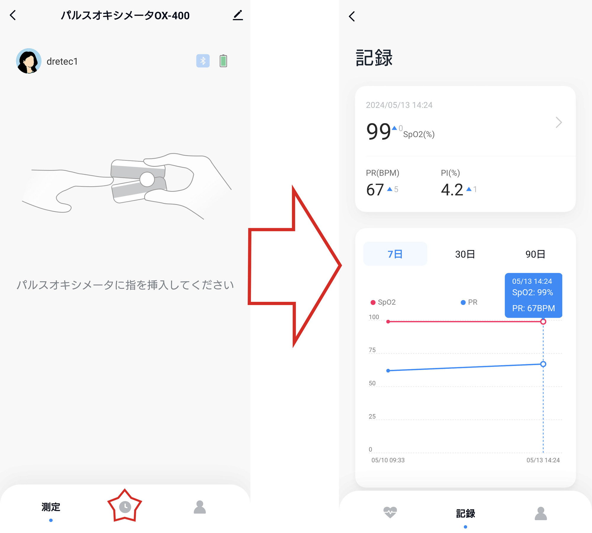 測定が正しく行えていない場合、アプリ上に数値を記録することができできない場合があります。「指を挿入したのにデバイス、アプリ上に数値が表示されない」のQ&Aをご参照ください。
