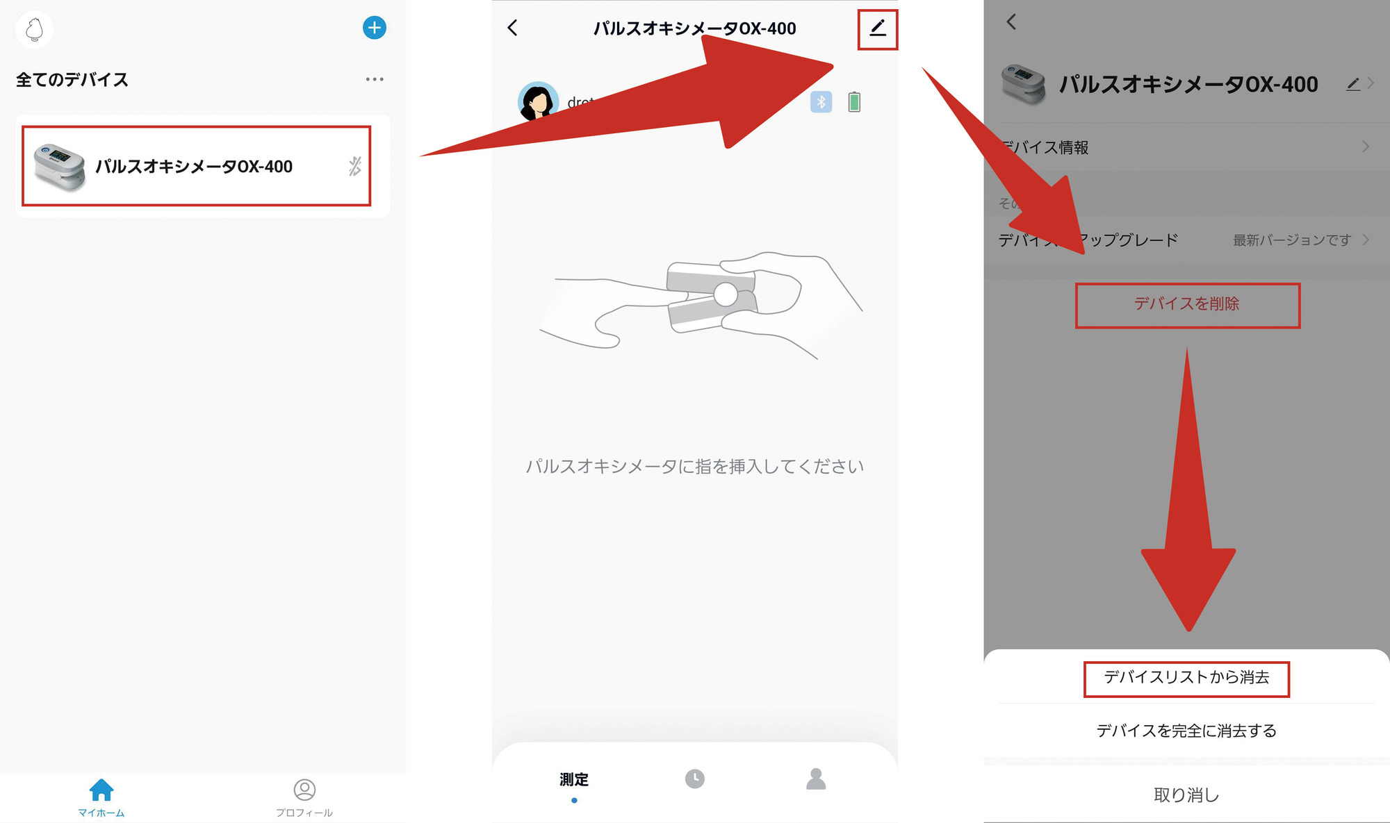 Q登録したデバイスを削除したい。Aデバイス(パルスオキシメータ)を選択後、