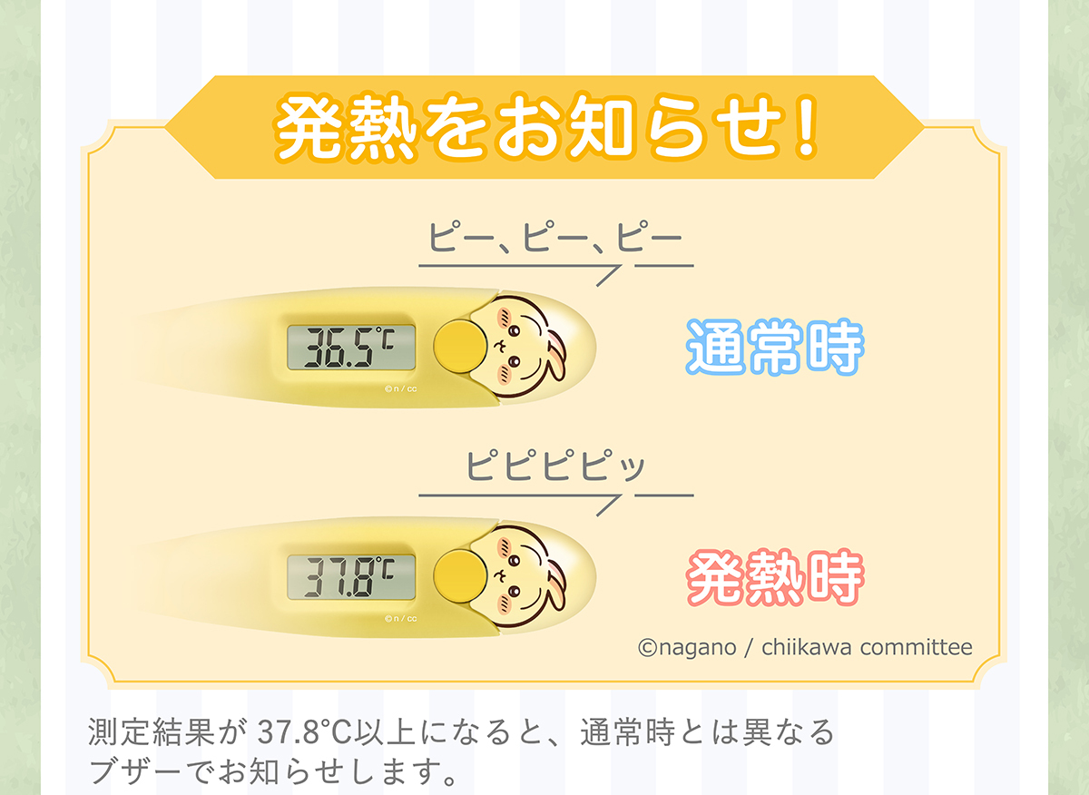 • 37.8℃以上をブザーのリズムを変えてお知らせ